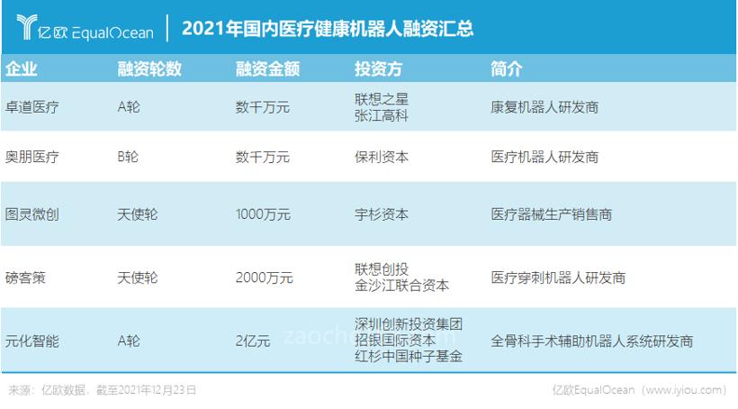中国医疗健康机器人相关企业融资事件为5起,占据2021年中国机器人相关企业融资事件的3%,融资总额为2.5亿元。