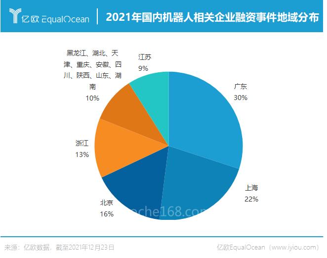此外,2021年中国机器人相关企业天使轮融资事件为8起,占比4.9%;C+轮融资事件为6起,占比3.7%;并购事件为3起,占比1.8%;上市企业3家,占比1.8%;Pre-B轮融资事件为2起,占比1.2%;种子轮融资事件为2起,占比1.2%;D轮融资事件为1起,占比0.6%。