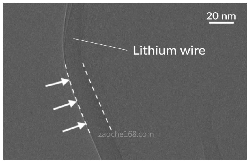 一条锂金属线上覆有一层SEI层,该层并被周围的液体电解质浸透;虚线表示该SEI层的外边缘。除去电解液后,SEI变干并收缩至先前一半厚度左右。(图片来源:SLAC)