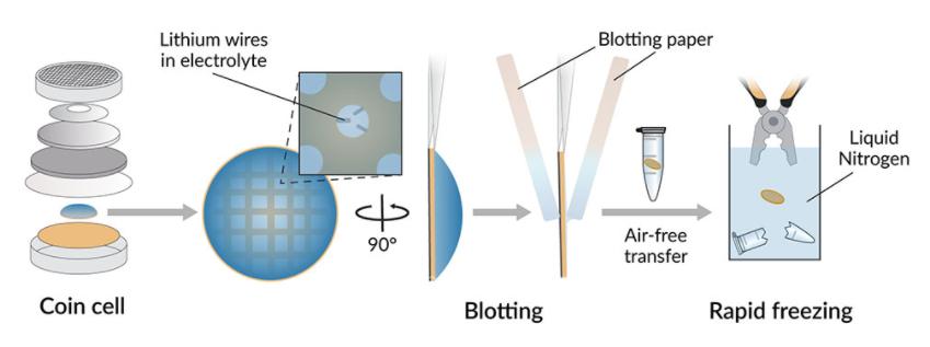 然而,这些薄膜仍然太厚,无法让电子束穿透并产生清晰的图像。研究人员提出了一个解决办法,用吸墨纸除去多余的液体。将吸墨网格立即浸入液氮中,使小薄膜冻成玻璃状,从而完美地保存SEI。这一切都发生在一个封闭的系统中,以保护薄膜不暴露在空气中。