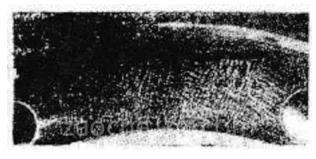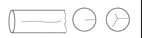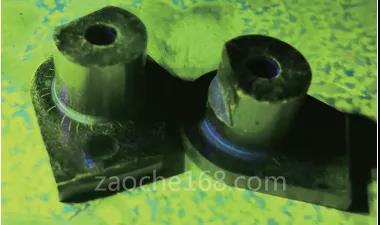 磁粉探伤显示出现的磨削裂纹如图2所示,磨削裂纹的方向必定与磨削方向垂直,其形状呈龟裂或龟甲状,而淬火裂纹只是呈断裂形状。由于两种裂纹产生的原因不同,因此其形态不同。磨削裂纹如图3所示,淬火裂纹如图4所示。