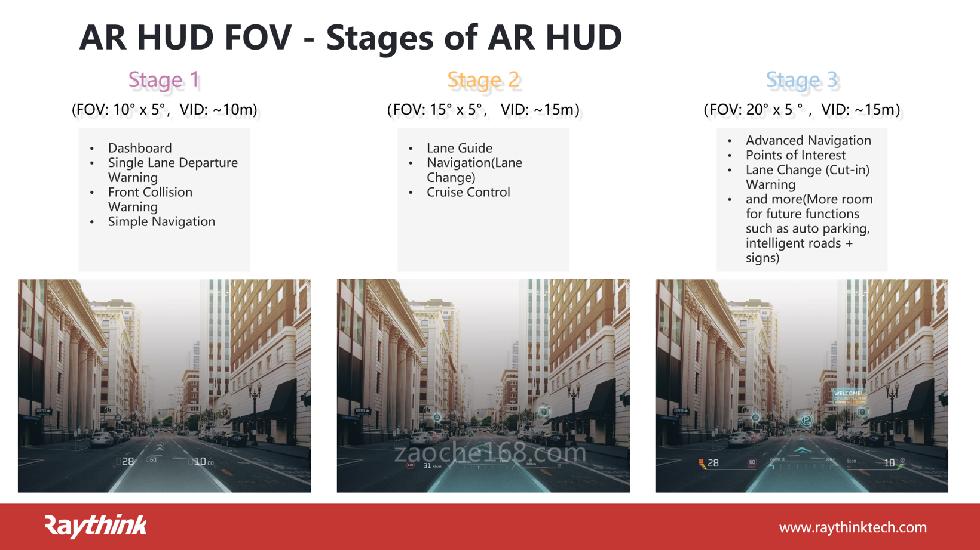 行业内普遍认为,HUD最重要的影响参数是FOV,以下图为例,第1阶段的视场角为10度,覆盖了大约1条车道,而第2阶段的视场角为15度,然后是视场角为20度的第3阶段,姜叡石相信这是AR HUD真正开始显示其价值的阶段,也是Raythink目前一款产品:AR HUD PRO所拥有视场角参数。Raythink AR HUD提供车道级AR导航,以及超车和接近车辆预警,某种程度上可以大大降低汽车被擦撞或追尾的风险。如图所示,超过20度FOV 的AR HUD能实现更多的功能,也是行业发展的最终目标。