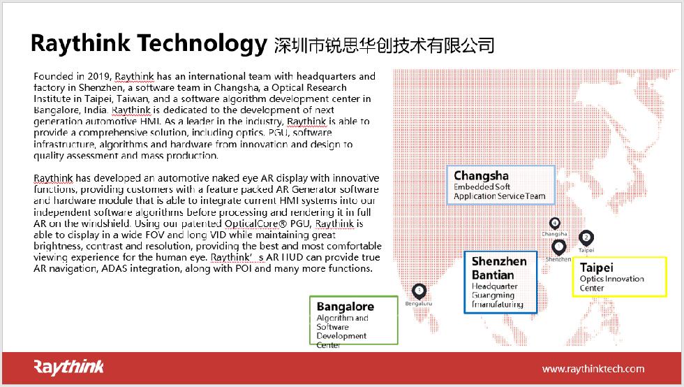 Raythink希望推动AR HUD创新并助力行业发展。Raythink总部及生产基地位于深圳,在全球建立起国际化的研发中心,拥有长沙嵌入式软件应用服务团队、台北光学创新研发中心以及印度班加罗尔算法和软件开发中心,专注于下一代汽车人机界面的开发。