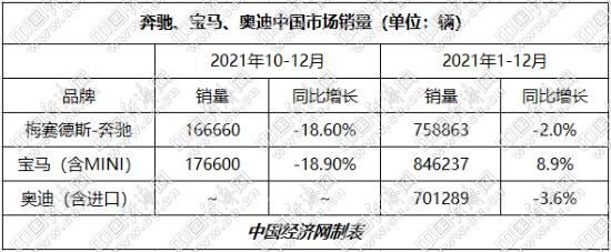 “国内汽车市场看豪华车,豪华车市场看奔驰、宝马和奥迪(BBA)。”过去几年,在车市整体低迷的大背景下,BBA逆势而上,不断创下新的销售记录。在“缺芯”笼罩的2021年,豪华车市场持续上扬,累计销售347.2万辆,同比实现两位增长。相比之下,BBA出现分化,宝马继续保持增长;奔驰和奥迪则小幅下降。