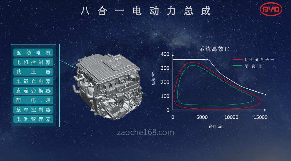 除了在零部件层级的优化之外,比亚迪在系统层面进行了创新,比亚迪最新八合一的电驱动,它集成了整个电机、电控、减速器、DC、OBC、配电、VCU和BMC。