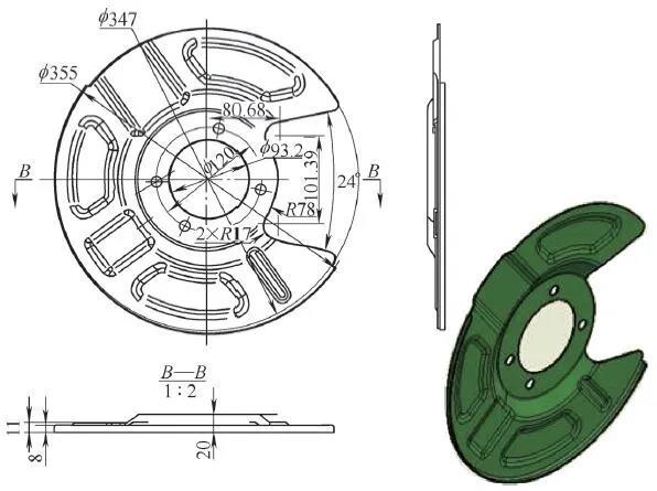 某模具工厂接到一对汽车刹车盘上的产品模具订单,产品名称为制动盘防尘罩(见图1),产品材料选用GW01铝合金,量产数约为100万件,最大外形尺寸约为φ350mm,料厚1mm。
