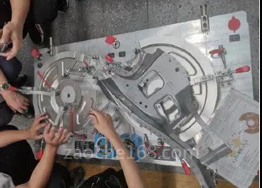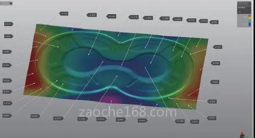 按照CAE分析的反弹数据进行模具生产后,模具进入产品试冲阶段。通过试冲结果来观察产品的实际变形情况,利用客户提供的产品检具进行数据采集。图6所示产品在检具(见图7)中反馈得到的相应数据显示,局部位置仍有1.2mm的弹性变形。结合该变形的数值、方向及位置,在UG软件中进行相应的曲面补偿调整。一般情况下,在利用UG软件调整完变形位置后,还要进行CNC补偿加工与钳工修复。