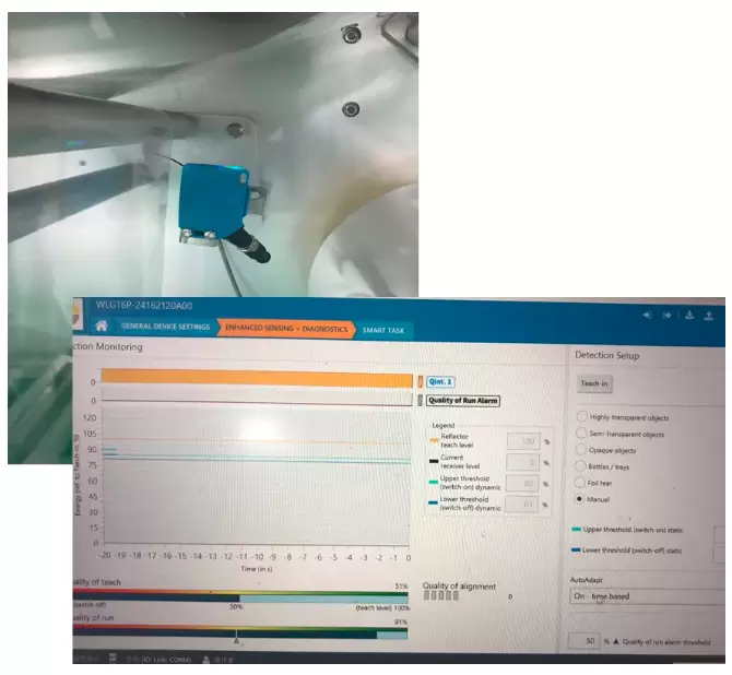 WLG16具有五种不同透明程度物体检测的预设阈值,也可通过IO-Link进行手动调节阈值,稳定检测各类物体