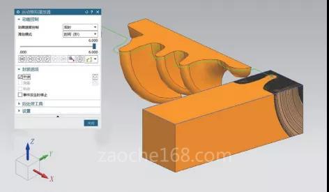 (5)创建解算方案及仿真动画 仿真模型定义完成后,必须定义运动分析的解算方案,并通过解算器求解,才能播放或查看每个时间点或位置的动画。选择主页→解算方案,指定类型为“动态分析”;在解算方案选项中,选择工作目录为仿真文件夹,解算结束时间设置是车削运动轨迹曲线总长度与驱动速度的商,单击“确定”完成解算方案创建。在主页选项卡中单击“求解”,完成解算方案求解。