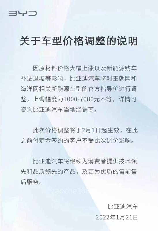 1月21日,比亚迪汽车官方发布关于车型价格调整说明,称因为原材料价格大幅上涨以及新能源购车补贴退坡等影响,其将于2月1日起对王朝网和海洋网相关新能源车型的官方指导价进行调整,上调幅度为1000-7000元不等,在此之前付定金签约的用户不受此次调价影响。