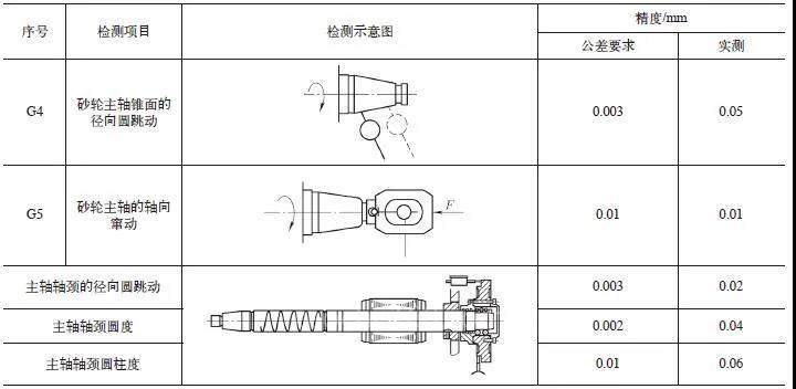 1)通过检测数据分析,砂轮主轴锥面的径向圆跳动实测数据值0.05mm,大于允许差值(允差是0.003mm);主轴轴颈的径向圆跳动实测数据值0.02mm,大于允许差值(允差是0.003mm);主轴轴颈圆度实测数据值0.04mm,大于允许差值(允差是0.002mm);主轴轴颈圆柱度实测数据值0.06mm,大于允许差值(允差是0.01mm)。主轴轴颈径向圆跳动、轴颈圆度和圆柱度严重超差,这是造成主轴经常出现“抱死”,造成机床无法正常工作,加工工件表面有明显振纹,以及工件表面粗糙度超差的主要原因。