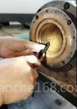 (2)滑动轴承的轴瓦修复 具体如下。1)粗刮轴瓦(见图3)。在主轴与滑动轴承配刮时,均匀涂抹红丹粉,采用浅刮工艺,下刀要轻。以主轴为基准进行研磨粗刮,把接触点先刮出来,刮削面应成小蝌蚪形状,刮刀完成每一次切削运动后,要不断交换运动方向,接触点成菱形、网格状,滑动轴承内表面的接触点应均匀,在25mm×25mm面积内接触点应有14~16个。当滑动轴承轴瓦上出现均匀点后,开始进行精刮。
