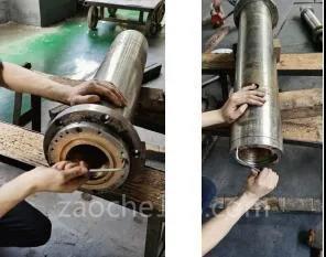 (1)主轴的修复 已磨损的主轴采用镀铬工艺恢复原尺寸,经精磨和抛光处理,保证其各尺寸精度和表面粗糙度达到精度标准。要求主轴轴颈相对主轴轴线的径向圆跳动≤0.003mm,圆度≤0.002mm, 锥度在每100mm长度上≤0.008mm,表面粗糙度值Ra为0.8mm,锥面相对主轴的径向圆跳动≤0.003mm。