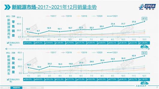 12月,新能源乘用车零售销量达到47.5万辆,同比增长128.8%,环比增长25.4%。1-12月新能源车零售298.9万辆,同比增长169.1%。
