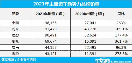 2021年造车新势力销量排名中,第一梯队阵容相对稳定,最后时刻上演惊天大逆转的小鹏冲到了销量第一位,蔚来和理想分列第二和第三名。第二梯队也不甘落后,哪吒、威马和零跑均实现了销量同比大幅增长,成绩表现异常抢眼。