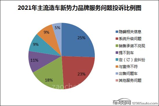 在取得出色业绩的同时,造车新势力发展多年来所积累的质量和服务问题也逐渐释放。来自车质网的投诉数据显示,2021年主流造车新势力品牌投诉量共计525宗,相比2020年激增650%。其中,涉及单纯质量类投诉188宗,服务类投诉201宗,服务问题投诉量相对较多,且投诉问题点较为集中。