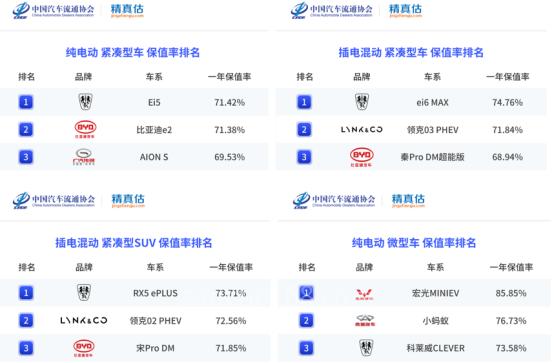近日,中国汽车流通协会和精真估联合发布了《2021年度中国汽车保值率报告》,其中上汽乘用车旗下多款车型上榜,荣威Ei5、荣威ei6 MAX、荣威RX5 ePLUS三款新能源汽车登顶细分市场榜单第一,MG3等多款燃油车也进入细分市场榜单TOP5之中。品牌方面,上汽乘用车旗下荣威、MG品牌保值率今年以来已保持连续多月正增长,三年保值率MG较今年1月涨幅高达6%,荣威更是大涨11.01%;同时,荣威品牌还在三年保值率年度榜单中跻身中国汽车品牌前十。