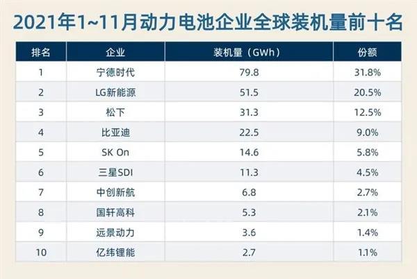 动力电池产能部分,据SNE Research数据显示,2021年1~11月,LG新能源全球动力电池装机量累计为51.5GWh,同比增长90%,市场占有率20.5%,排名第二,而宁德以79.8GWh的装机量,以31.8%市占率排名第一。