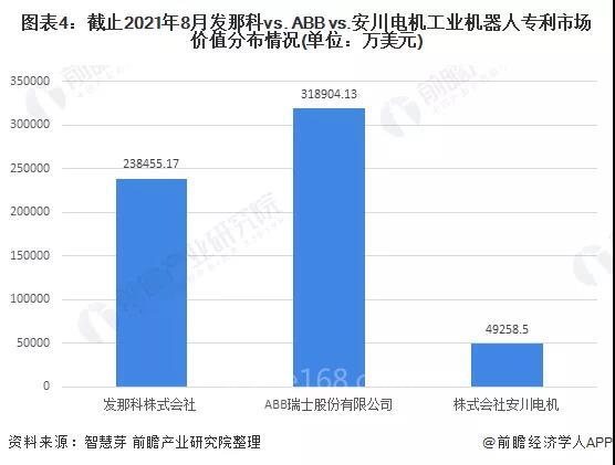 ABB瑞士股份有限公司的专利总价值高达318904.13万美元,发那科的稍低,为238455.17万美元,安川电机远低于前两家,仅有49258.5万美元。