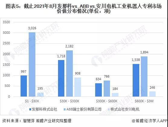 从价值分布来看,ABB的工业机器人相关专利的价值大多低于3万美元,而发那科与安川电机的专利价值则主要分布在3万-30万美元的区间。