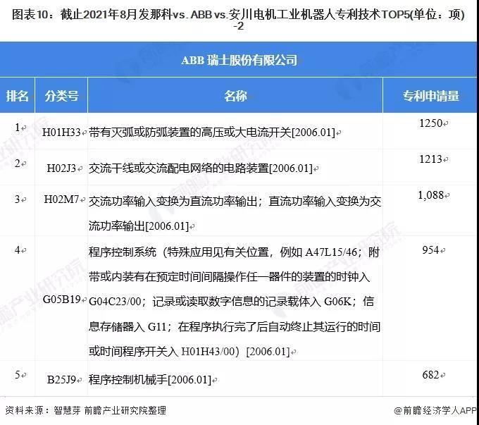 目前,“程序控制系统(特殊应用见有关位置,例如A47L15/46;附带或内装有在预定时间间隔操作任一器件的装置的时钟入G04C23/00;记录或读取数字信息的记录载体入G06K;信息存储器入G11;在程序执行完了后自动终止其运行的时间或时间程序开关入H01H43/00)[2006.01]”是发那科与安川电机的主要布局领域,二者在这一领域的专利申请数量分别为5275项与1389项,“带有灭弧或防弧装置的高压或大电流开关[2006.01]”是ABB的主要布局领域,专利数量为1250项。