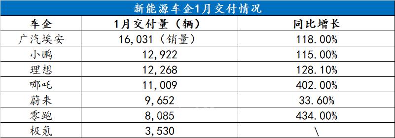 而刚开年,蔚来单月交付了0.96万辆;小鹏卖出了1.29万辆,月销过万成了常态;理想用连续三个月销量破万的成绩攻入从1到10的全新阶段;单月销量达1.1万辆的哪吒紧随其后;零跑终端交付了0.81万辆,够到了月销破万的门槛······