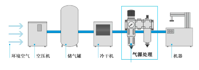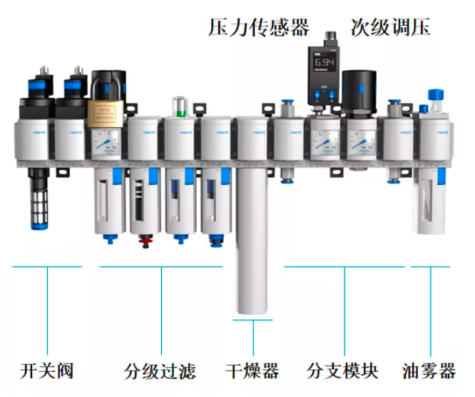 为了达到特定的气源质量,气源处理需要对不同的气源处理装置进行组合,以保障不同生产应用环境中的压缩空气质量。