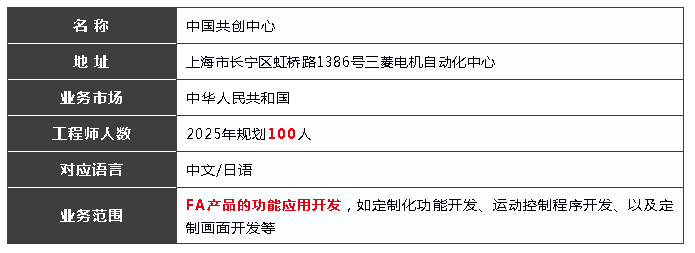 2022年3月31日,三菱电机株式会社宣布将在中国上海开设“中国共创中心[Collaborative Engineering Center(China)]”,该中心于4月1日正式启动工厂自动化(FA)产品的应用开发业务。