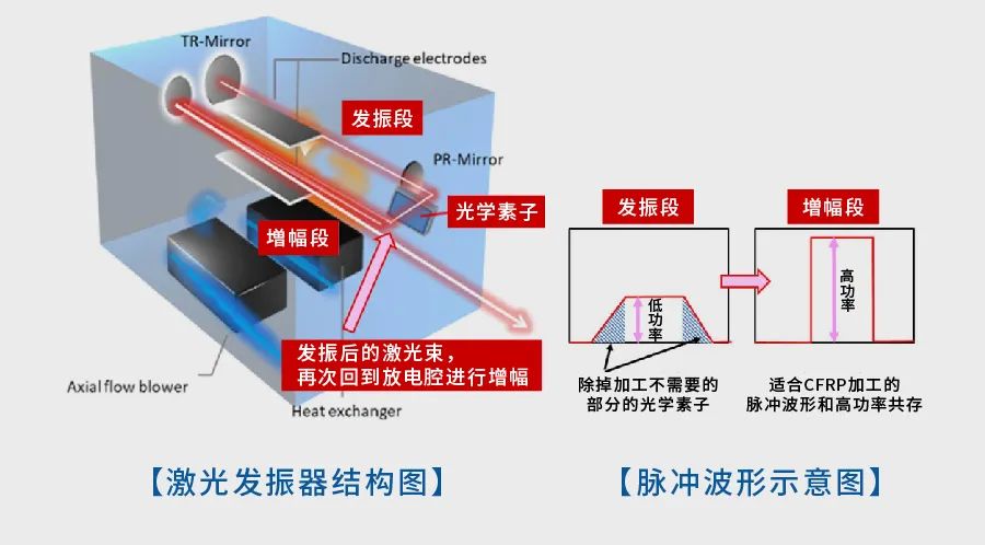 配备Integrated-MOPA※2方式的三轴正交型※3二氧化碳激光发振器,将发振器和增幅器集成在同一个外壳中,通过简单的结构发出适于CFRP加工的激光(已申请专利),解决了迄今为止难以实现的CFRP精密加工问题。