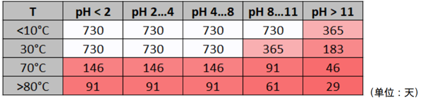 得益于每年数十万支 pH 电极的销量以及遍布全球数百万的测量点,那些服役中的或失效了的电极,以及与之相关的服务报告,工况信息,寿命数据,通过系统的梳理,建模和验证,逐步推演出了一套完整的,基于不同型号(应对不同工况)的 pH 电极在理想状态下的理论使用时间。