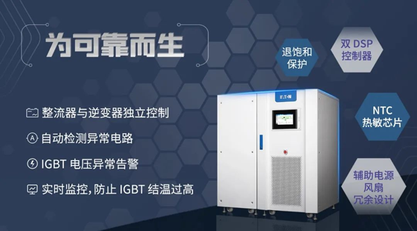 对温度比较敏感,且与 UPS 可靠性息息相关的 IGBT 模块,9EHD 2.0 的 IGBT 驱动电路集成退饱和保护功能,侦测 IGBT 电压是否正常并及时告警,以及时关断封锁驱动信号,避免直流母线直通故障。