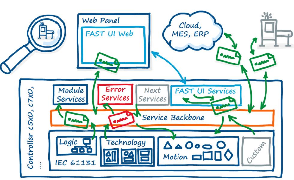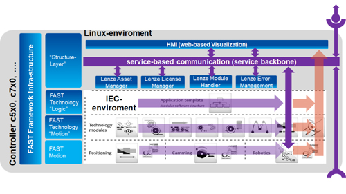 如果将FAST Toolbox比喻为身体的手和脚,那么FAST Framework则是身体的骨架结构。用户需要从使用以及维护的角度,去了解,操作自己的设备,FAST Framework在不影响运动控制以及逻辑控制的基础之上,提供了包括软硬件资产管理,报警即错误管理服务,基于Web的触摸屏服务以及云端交互,诊断等服务;对于Lenze的C5x0,C750控制器系列而言,这些服务是运行在Linux系统中的,同时在用户IEC61131编程环境中提供了服务的接口。