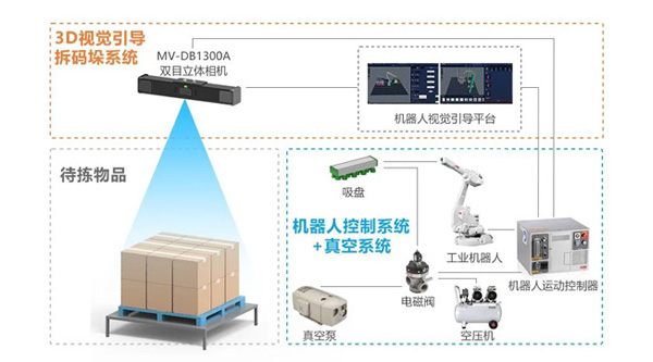 3D视觉引导拆码垛系统由MV-DB1300A双目立体相机和机器人视觉引导平台两大核心组成,3D相机获取货物深度信息及高清2D彩色图像,通过平台软件内置3D视觉算法和智能轨迹规划算法,完成货物定位及分割,并控制机械臂相应的抓取或码放动作。