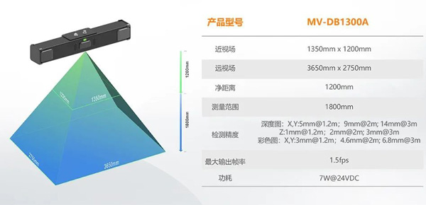 MV-DB1300A具有较大的基线距,同时增加了激光器的数量,搭配独有的混合编码专利技术,使相机的精度进一步提高,Z向深度图精度可达为3mm@3m。