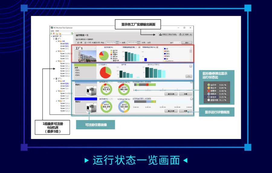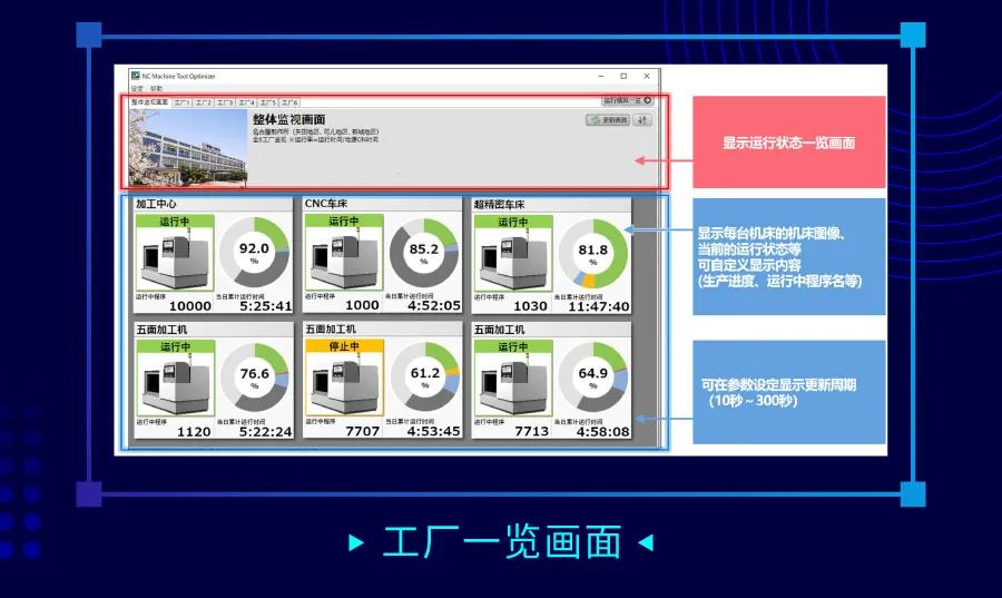 以工厂为监控单位,可确认各工厂的运行概况(当日运行率、生产进度)及注册的各机床运行状态。
