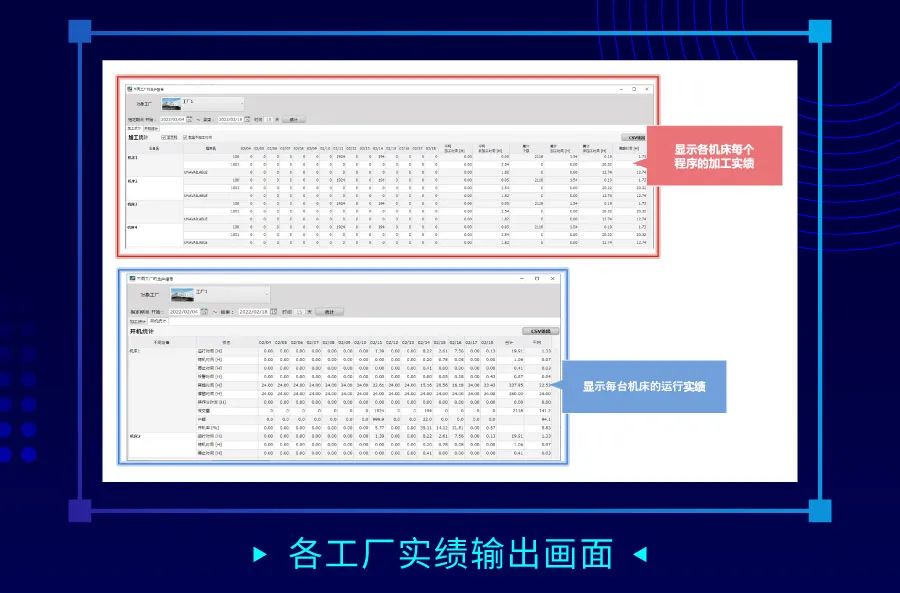 可汇总显示所选工厂的组/机床整体的运行实绩。