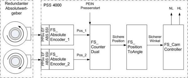 软件工具PAS 4000会对这2路数据进行交叉校验,来判断信号之间是否超出了允许的容差。随后,通过特定功能块将安全位置数据转换为安全角度数据,这样就相当于拥有了虚拟的安全凸轮。