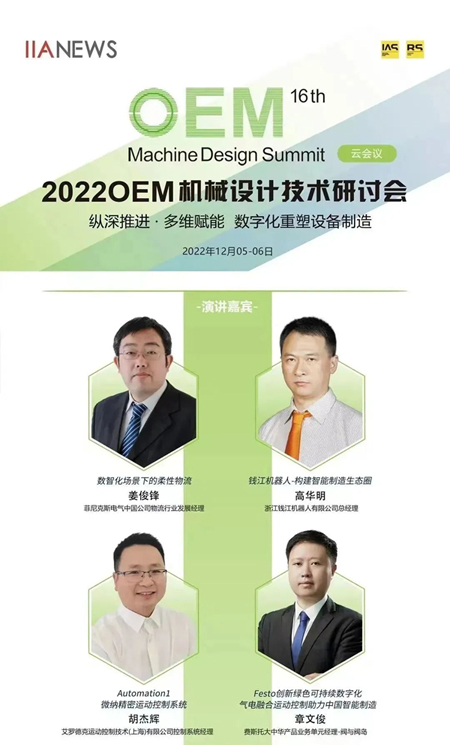 12月5日-6日,由中国国际工业博览会组委会主办,国际工业自动化、东浩兰生(集团)有限公司承办的2022 OEM机械设计技术研讨会将在云端开启,论坛将邀请菲尼克斯电气、钱江机器人、艾罗德克、费斯托、易福门电子、威琅电气、图尔克、PILZ等企业嘉宾,围绕运动控制、工业安全、工业传感与连接、数智化场景实践、构建智能制造生态圈等话题进行交流和分享,以“纵深推进·多维赋能”为主题,共同探讨数字化如何重塑设备制造。