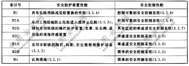 根据风险评估表格中的定义,确定风险降低的索引号,再从下表1确定安全防护装置的性能和安全控制系统性能的最低要求。