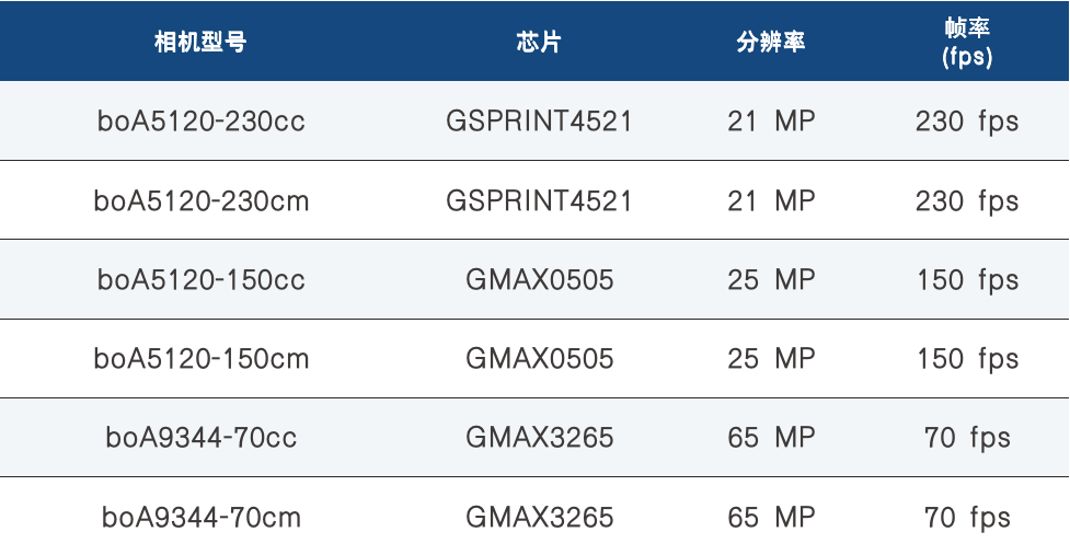 新款四通道CXP-12接口相机搭载了Gpixel全局快门芯片(GSPRINT4521、GMAX0505和GMAX3265),分辨率从2100万到6500万像素,帧速率最高可达230 fps,可满足各类高速高精度应用。