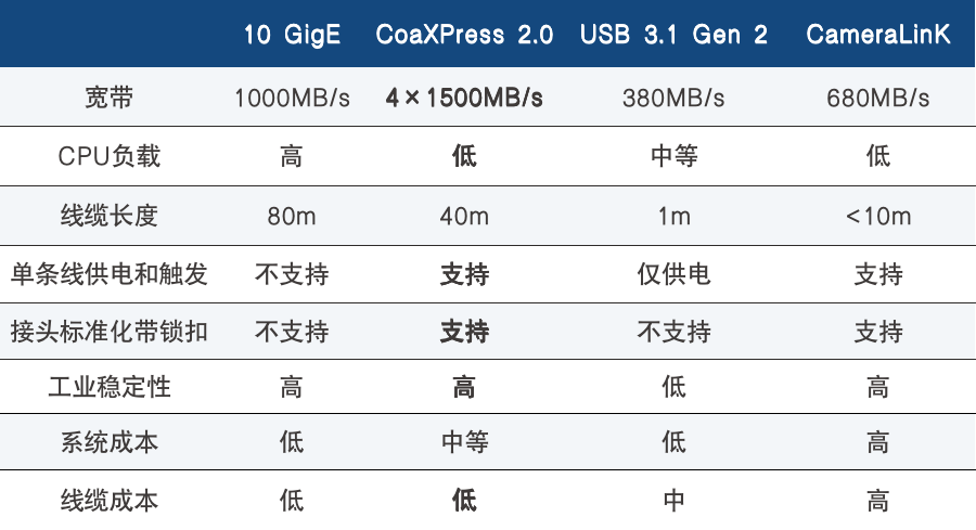 CXP-12接口可支持每通道12.5Gbps的高带宽,线缆长度达40米,可实现远距离传输大量数据,因此在高速高分辨率的应用场景中,CXP-12接口是理想之选。