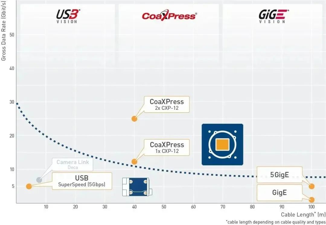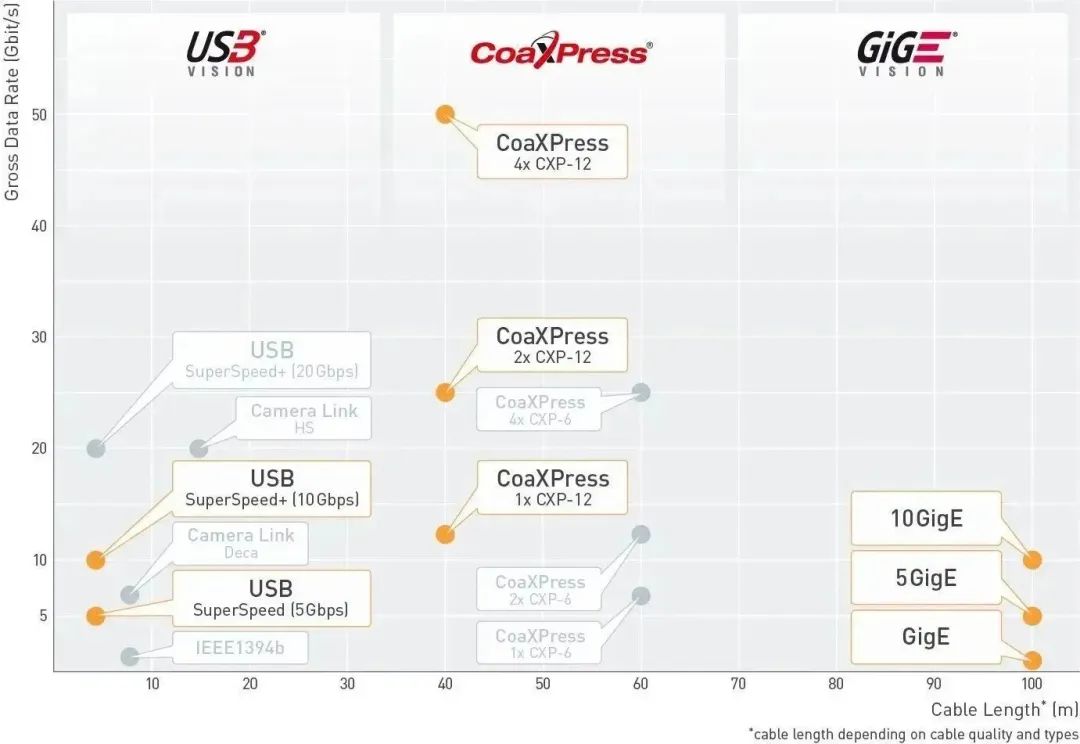 视觉系统该如何实现平稳的数据传输和高效的运行表现呢?选择正确的接口至关重要。带宽、线缆长度、以及多相机体系都是选择接口的重要衡量标准。