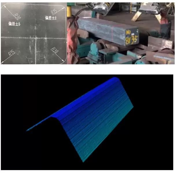 每种钢坯的4个顶角处只会有R15±2、R30±5两种尺寸。使用SICK 3D相机可有效解决钢胚入炉料型难以区分的问题,避免混料。而且替代了人工,实现产线全检,并且自动将钢胚尺寸、倒角尺寸上传到数据库中存档。