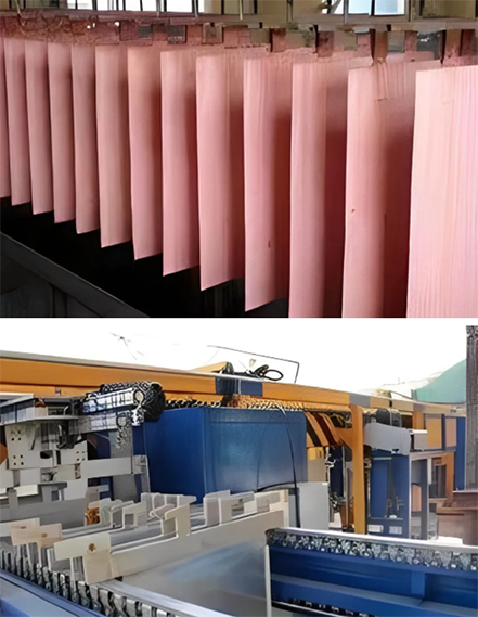 铜材料在火法提炼后通过电解附着在阳极板上面,然后由自动剥铜机将其从极板剥离。