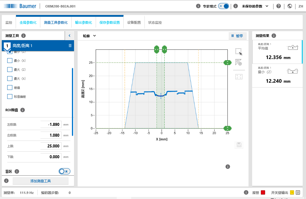 通过OXM200传感器本身自带的web interface 功能,工程师可以直观地看到胶水表面在成像芯片上的影像效果,并且根据被测物尺寸的大小来自由调整有效测量区域。在3毫米宽度的区域内,传感器可以测量多达100个点的高度数据,测量重复精度可以达到微米级。
