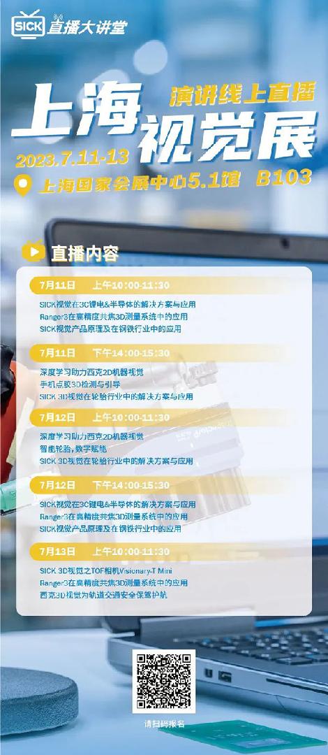 2023中国(上海)国际机器视觉展览会将于2023年7月11-13日在国家会展中心(上海)举办, 作为专业机器视觉及方案解决服务商,SICK将携带各种视觉方案参展,包括轮胎激光刻字工作站、线共焦3D测量传感器、3D胶路引导检测设备、锂电电芯尺寸外观全检机、3D TOF相机在测量及安全领域的复合型应用、智能相机深度学习平台等,共同打造“Vision Plus+”概念。