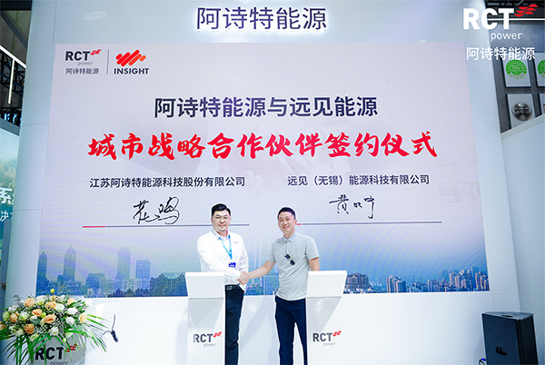 阿诗特能源销售副总花鸣与远见能源CEO黄双宁共同签订了城市战略合作协议并合影留念。本次强强联合、优势互补的战略合作,将帮助双方在国内工商业侧储能解决方案领域资源共享、共同进步。未来双方将合力为更多工商业企业提供低碳(Decarbonated)、分布式(Decentralized)、数字化(Digitalized )的零碳解决方案,帮助客户向低碳绿色转型。