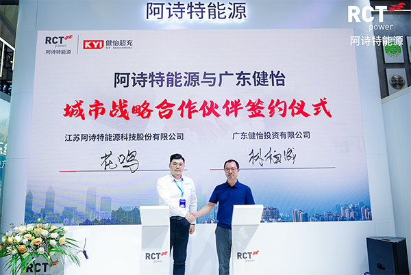 阿诗特能源销售副总花鸣与广东健怡副总经理林柏成签订了城市战略合作协议并合影留念。未来广东健怡将利用阿诗特能源先进的储能技术,建设更多更优质的光储充一体化充电站,并在阿诗特能源的技术支持下完成电力调度能力的强化和电能利用效率的提升。