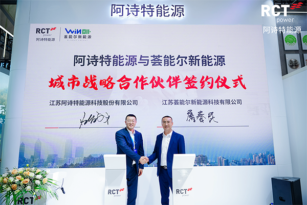 阿诗特能源总经理石发成与荟能尔新能源董事长屠春民签订了城市战略合作协议并合影留念。未来双方将聚焦在技术交流、资源共享、项目合作、市场推广等方面的合作。希望本次深入合作能够帮助双方进一步共同拓展国内储能市场,为彼此创造更大的商业价值。