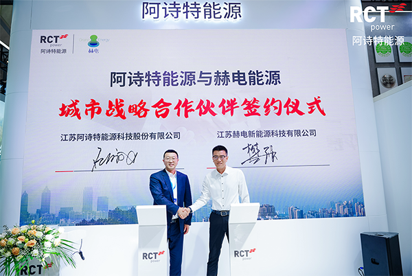 阿诗特能源总经理石发成与赫电能源董事长樊强签订了城市战略合作协议并合影留念。本着“平等、友好、互利、互信”的原则,双方一致同意建立城市战略合作伙伴关系,在工商业侧储能、电源侧储能等业务领域展开合作,共同推动清洁能源转型,实现合作双赢的发展目标。